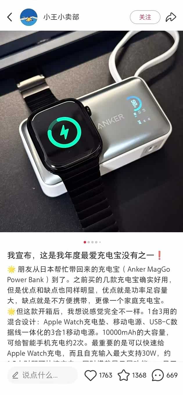 在社交平台小红书上,博主“小王小卖部”发帖分享道,最近收获了一款“年度最爱充电宝”,就是朋友从日本带回的AnkerMagGo。帖子还写道:“可以快速充电,之前买的其他款充电宝都不如这款。”