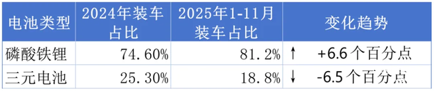 从数据上可以看到,磷酸铁锂凭借成本、安全性等优势,在乘用车、商用车等领域进一步扩大份额;三元电池虽在高性能车型中仍有需求,但整体占比继续下降。