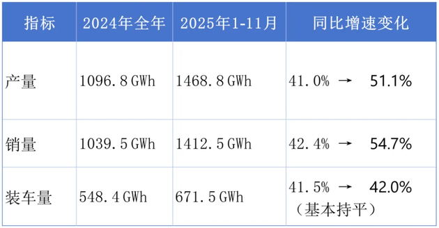 2025年1-11月,我国动力和其他电池累计产量为1468.8GWh, 累计同比增长51.1%;销量为1412.5GWh, 累计同比增长54.7%;累计装车量671.5GWh, 累计同比增长42.0%。