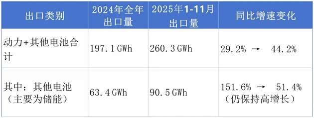 2025年电池出口表现尤为亮眼,整体出口增速较上年大幅提升,其中面向储能应用的电池出口成为核心增长引擎。