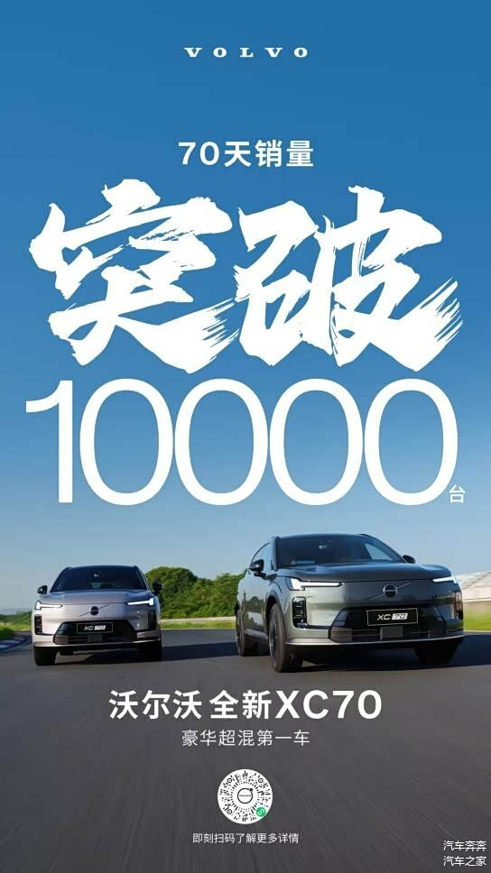 全新 XC70 于 12 月 5 日正式达成累计销量突破 10,000 辆的里程碑,从上市到破万只用了 70 天,成为今年豪华混动市场最具讨论度的新秀车型之一。其亮眼表现也在真实市场中印证了消费者对其安全基因、混动实力与智能体验的高度认可,让“豪华超混”概念真正走进大规模用户圈层。