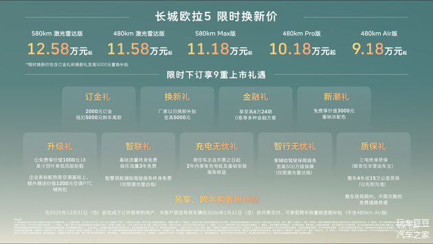 【中国·保定】2025年12月16日——今日,长城汽车欧拉品牌全新A级纯电SUV——长城欧拉5正式上市。新车共推出5款配置,建议零售价区间为 9.98万至13.38万元,限时换新价9.18万元起(限时换新价包含“订金礼”和“换新礼”至高5000元以旧换新补贴)。为回馈广大用户的热爱与支持,即日起至2025年12月31日,用户下订并锁单即可尊享包含订金礼、换新礼、智行无忧礼在内的9重上市好礼,以及跨年购置税补贴(不含480km Air版)等丰厚购车权益。凭借诚意十足的价格权益与越级产品力,长城欧拉5致力于成为全球年轻用户的“严选搭子”。
