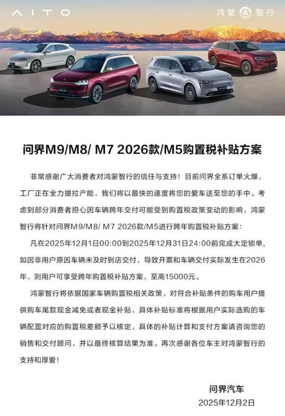 值得一提的是,面对即将到来的年末购车季,问界还推出购置税补贴方案:凡在2025年12月1日00:00至2025年12月31日24;00前完成大定锁单的用户,如因非用户原因导致车辆在2026年交付,即可享受至高15000元的购置税补贴,让消费者能够毫无顾虑地把握年末购车良机。