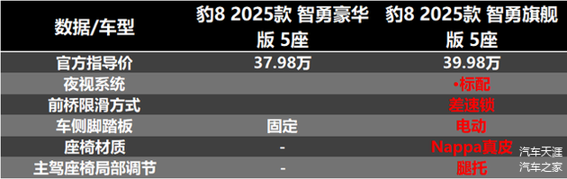 相比之下,豹8的选择就跟简单一些了,一共就两个版本,高低配车型之间2万元的差距主要体现在夜视系统,前桥差锁速、电动脚踏和Nappa座椅等配置上,个人觉得这些配置都是可有可无的,所以还是建议上低配,37.98万元的指导价,算上优惠和保险等费用,落地应该在35.8万元,也是很香的。