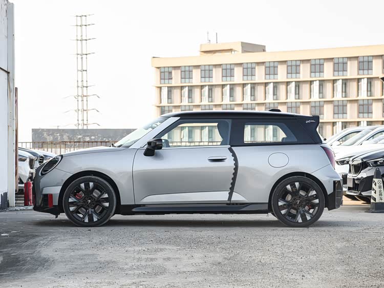 侧面造型方面,车顶线条比较平直,而且还营造出了悬浮式车顶,同样是MINI的标志性设计语言,腰线采用了分段式设计,点缀出了车身侧面的层次感,门把手则是内凹式设计,能够起到降低风阻的作用;轮眉和侧裙部分设计有隆起的筋线,有着一定的肌肉感;轮毂采用了四幅式熏黑造型,风格足够大气。