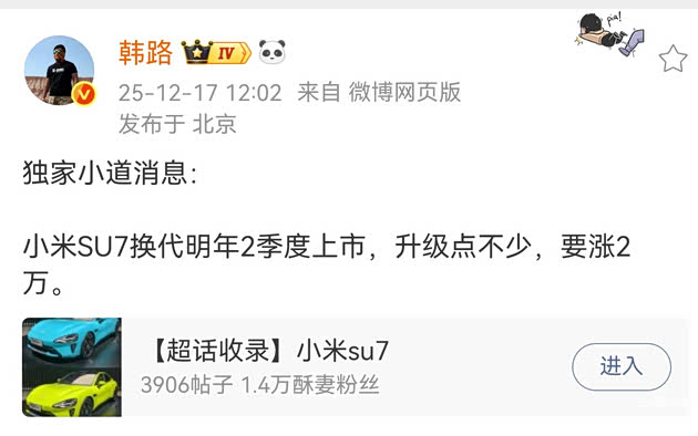 韩路在个人社交平台曝出了猛料,称: 小米SU7换代明年2季度上市,升级点不少,要涨2万元。