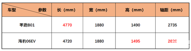 车身尺寸方面,零跑B01的长宽高分别为4770/1880/1490mm,轴距为2735mm,定位紧凑型车;而海豹06EV的长宽高分别为4720/1880/1495mm,轴距为2820mm,定位中型轿车。从数据上看,两款车型在长宽高方面相差不大,只是后者在轴距上更有优势,内部空间更值得期待。