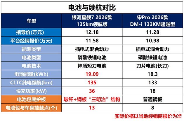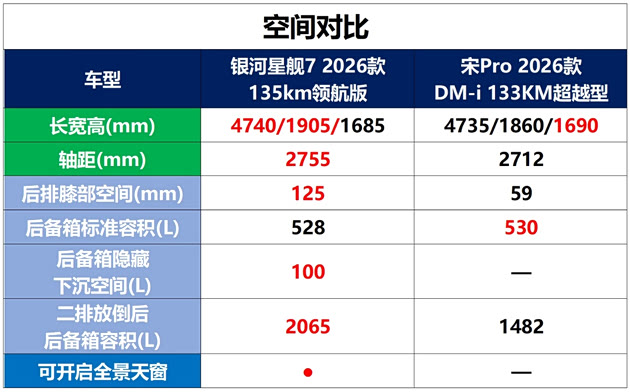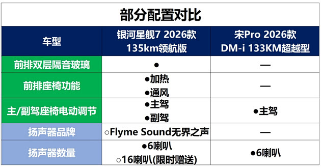 大家知道,2026年开始国家对插混(增程)车辆享受购置税减免政策做了调整,要求纯电续航不低于100km,所以现在推出的新款插混车辆都提升了纯电续航,2026款 银河星舰7 EM-i和2026款宋Pro DM-i也是,纯电续航都提升了不少。我们拿价格相近的两款车型2026款银河星舰7 EM-i135km领航版和2026款宋Pro DM-i133KM超越型,对比一下: