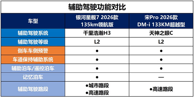 银河星舰7 EM-i和宋Pro DM-i的辅助驾驶能力都蛮强的,一个搭载千里浩瀚辅助驾驶H3方案,一个搭载天神之眼C。除了高速领航和智能泊车之外,新款银河星舰7 EM-i还具备城市驾驶辅助功能。
