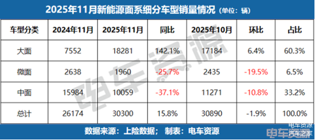 微面车型持续萎缩,销量仅1960辆,同比下降25.7%,市场份额进一步收缩;中面车型同样面临压力,销量守住1万辆大关,但同比下降37.1%,环比下降10.8%。