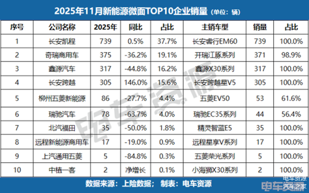 在整体规模持续收缩的微面市场中,竞争格局高度集中。TOP10企业几乎均以一款主力车型支撑整体销量,凸显出在细分市场萎缩背景下“单品聚焦”策略的有效性。长安凯程以739辆的销量、37.7%的市占率稳居第一,其旗下 长安睿行EM60单一车型贡献了全部销量,展现出强大的产品统治力与市场认可度。