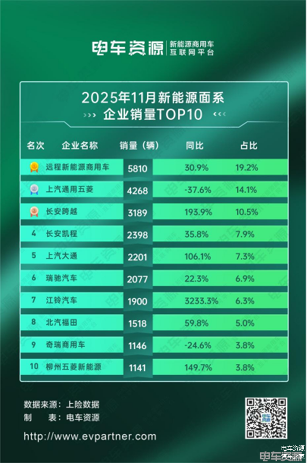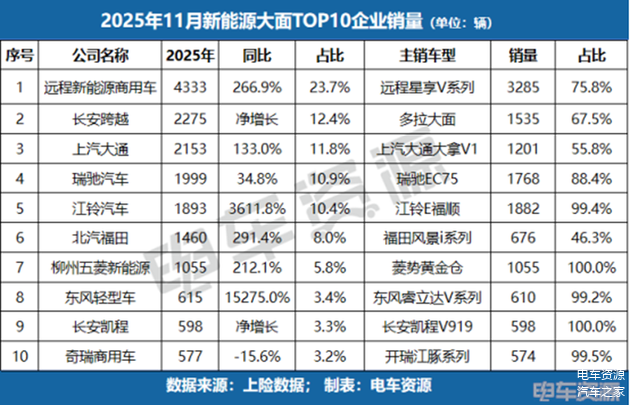 新能源面系市场重心仍然加速向更大载货空间的车型转移,2025年11月全面新能源物流车面系车型总销量达3万辆,同比增长15.8%,但环比已经连续下降,本月环比微降1.9%。