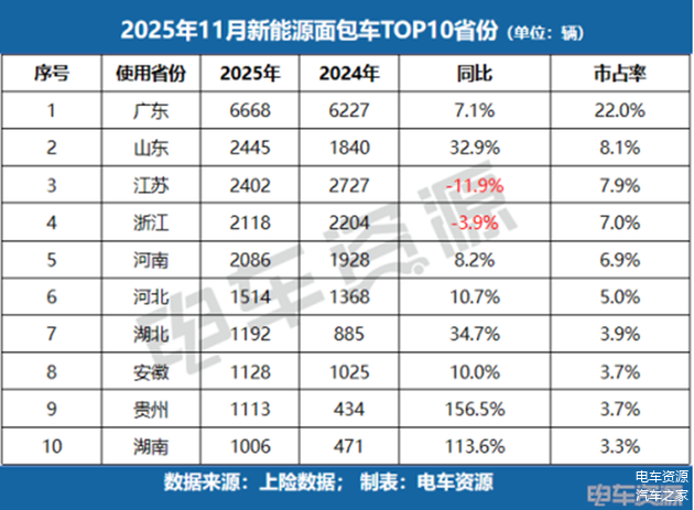 从省份格局来看,广东省以6668辆的销量、22%的市占率持续领跑,其龙头地位稳固,是检验产品竞争力与影响力的核心战场。山东省表现突出,销量达2445辆,同比增长32.9%,超越传统面包车强省江苏与浙江,跃居月度销量第二位,显示出强大的增长动能。相比之下,浙江省与江苏省销量同比分别小幅下降3.9%与11.9%。