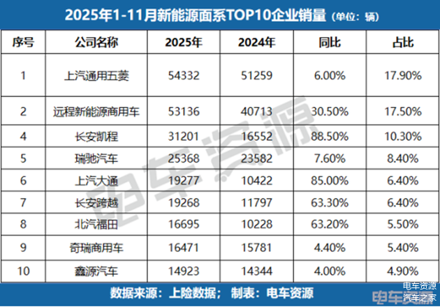 从2025年1-11月累计销量来看,格局相对稳定上汽通用五菱(5.4万辆)与远程新能源商用车(5.3万辆)组成第一梯队,累计份额合计超35%。长安凯程、瑞驰汽车、上汽大通等位列其后。