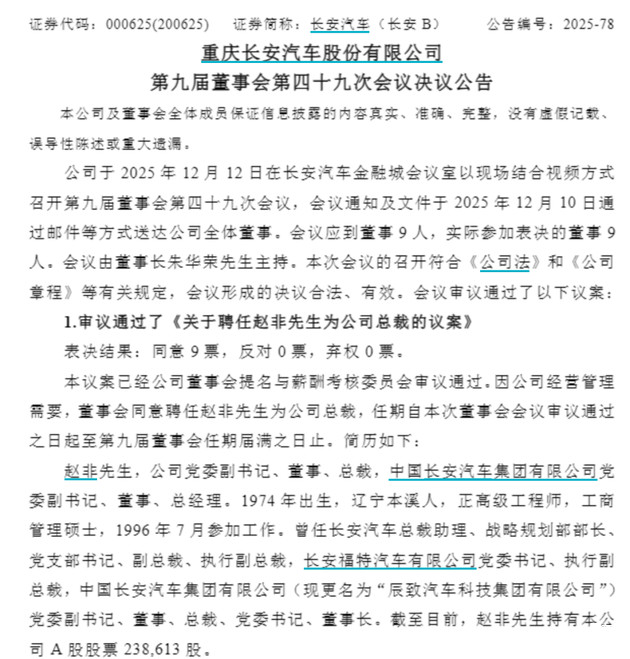 12月13日,长安汽车通过第九届董事会第四十九次会议决议,正式聘任赵非为公司总裁,任期至本届董事会届满,相关任命即刻生效。