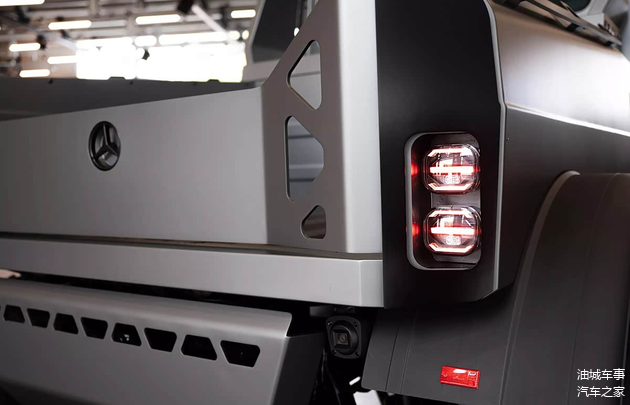 从外观设计来看,车辆整体采用哑光灰色涂装,这种颜色选择不仅增强了耐用性,也赋予了一种低调的视觉质感。前脸部分换装了造型较为夸张的保险杠,并在多个位置集成LED灯组,这些灯组在夜间或低光照条件下能提供更好的照明效果。车身侧面,20英寸防脱轮圈的使用有助于提升越野时的稳定性,而电子后视镜的引入取代了传统物理后视镜,这可能改善空气动力学表现并减少视野盲区。车后货厢配备有龙门架,饰板设计趋向简约风格,整体线条显得更为流畅。在车尾及其他细节处,镂空三角形设计元素被多次运用,这种设计既保留了军事风格的硬朗感,又增添了现代科技气息,让整车看起来不那么单调。