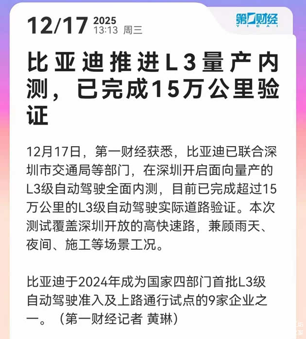 据了解,比亚迪已联合深圳市交通局等部门,在深圳开启面向量产的L3级自动驾驶全面内测,目前已完成超过15万公里的L3级自动驾驶实际道路验证。比亚迪推进自动驾驶内测以安全为核心,覆盖深圳开放的高快速路,兼顾雨天、夜间、施工等不同场景工况,全面验证L3级产品成熟度和可靠性,为国家L3级自动驾驶落地提供实践依据。据悉,2023年比亚迪就已获得国内第一张L3级自动驾驶测试牌照,并于2024年成为国家四部门首批L3级自动驾驶准入及上路通行试点的9家企业之一。
