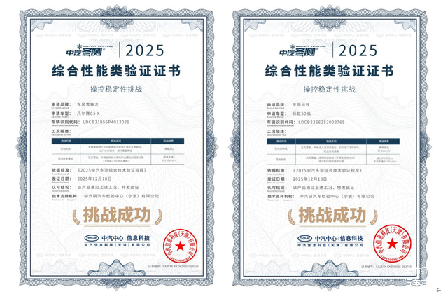 12月18日,东风雪铁龙凡尔赛C5 X与东风标致508L在中汽中心举办的极寒驾控安全验证中,凭借雪地爬坡、高速爆胎、双移线等项目的稳定表现,双双获得“操控稳定性挑战”证书。