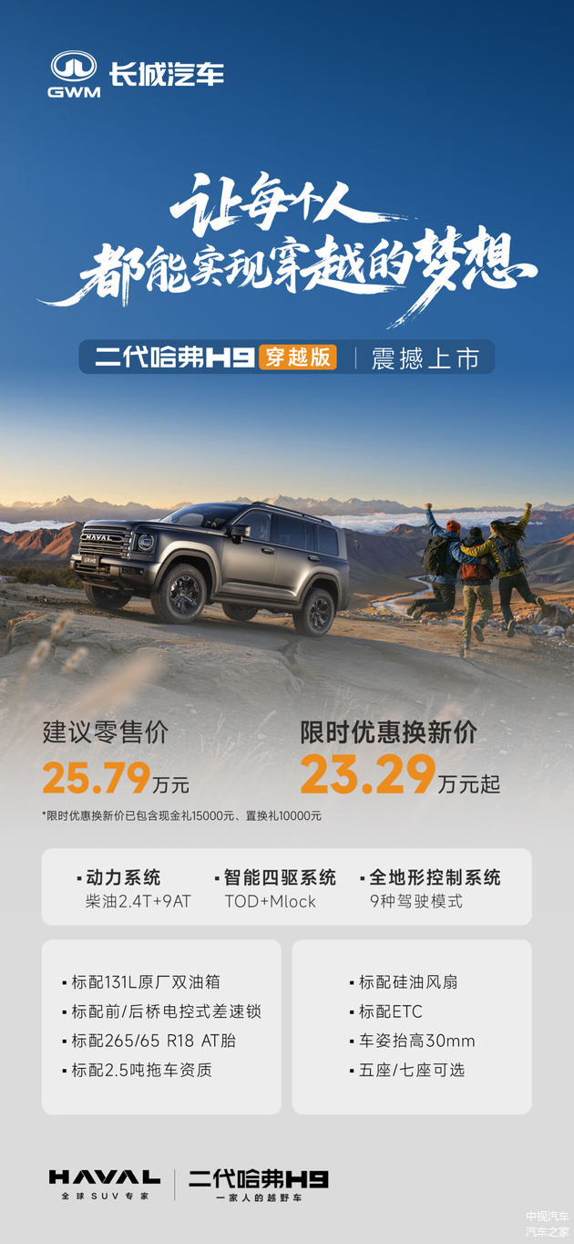 随着二代哈弗H9穿越版的上市,H9系列车型的市场版图将进一步拓展:2024年9月,二代哈弗H9上市,让每个追求高品质生活的家庭都能以更加轻松的方式,一起探索世界、享受生活;2025年8月,为满足用户对越野更极致的追求,二代哈弗H9勇士版推出,让每一位热爱越野、敢于挑战的“勇士们”,都能更尽兴、更畅快地享受不凡旅程;如今,二代哈弗H9穿越版又为每一个人的穿越梦想而来,以更长的续航,更可靠的性能,更舒适的驾乘体验,陪伴大家探索更广阔的天地!