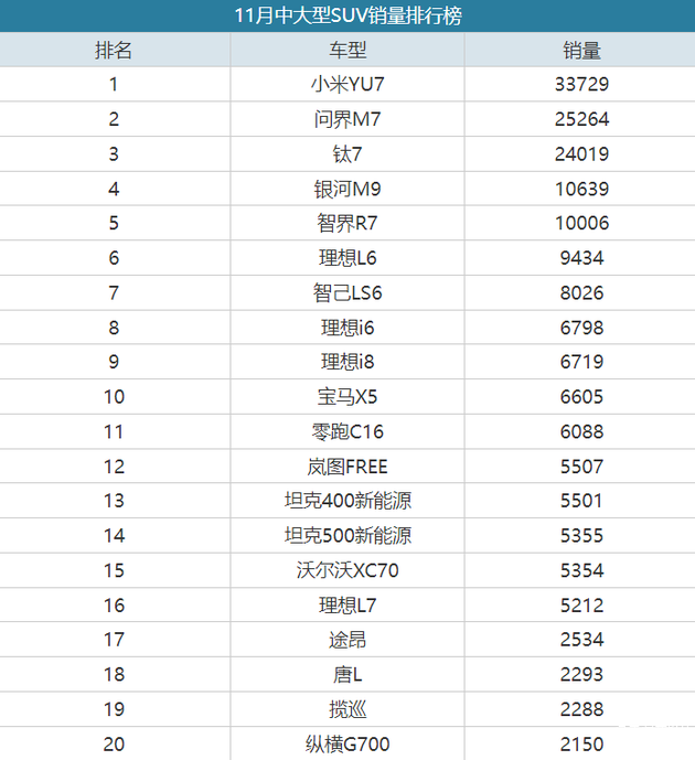 自从 小米YU7今年6月份上市以来,就一直称霸中大型SUV市场,其11月销量33729台,再次拿下该细分市场销量冠军,紧随其后的是问界M7和方程豹钛7,其11月销量为25264台和24019台。
