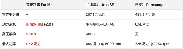 跟售价297.1万的兰博基尼Urus SE的单前电机+4.0T V8的动力组合相比,最大马力超出152匹;跟售价接近500万的12缸6.5升的法拉利Purosangue相比,最大马力大出四分之一左右,性能表现“遥遥领先”。