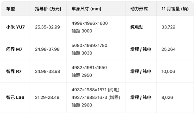 细分来看,这一市场的竞争格局存在明显分化。纯电专属车型仅有三款,分别是小米YU7、理想i6和理想i8,其余五款车型均同时提供纯电、增程式两种版本。