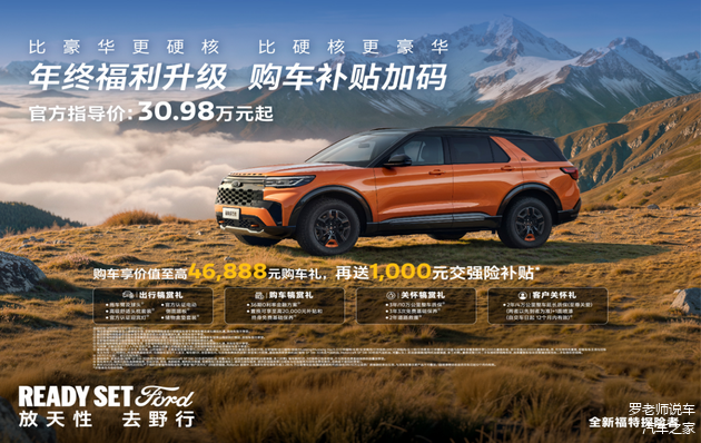 年终不仅是收获季,更是启程时。现在,全新福特探险者携重磅礼遇硬核“价”临,12月限时尊享价值至高46,888元的综合购车礼遇,叠加1,000元交强险补贴,助你轻松解锁全能探索生活。
