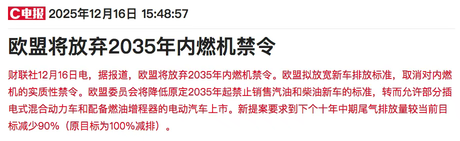 欧盟或松绑2035年燃油车禁令,允许部分插电混动及增程式电动车上市,减排目标从100%降至90%。欧洲车企直呼“压力山大”,面对特斯拉和中国电动军团竞争,直言“务实调整更符合市场”。那么,这一政策反转,是绿色转型的“灵活变通”还是产业竞争力的“妥协退让”?#欧盟燃油车禁令松动 #欧洲车企求生战