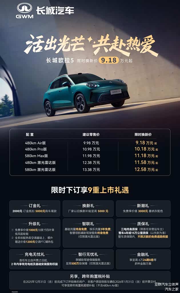 12月16日,长城欧拉5正式上市,新车共分为5个版本,官方指导价为9.98万元-13.38万元,叠加换新礼和订金礼,最高可优惠8000元,限时换新价可低至9.18万元起。
