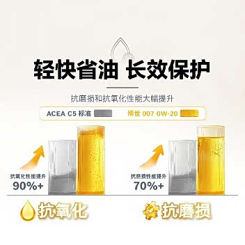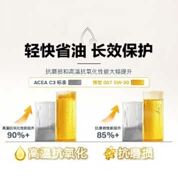 粘度等级为5W-30的博世007机油,相较ACEA C3标准,高温抗氧化性能提升90%+,抗磨损性能提升85%+,满足奔驰MB 229.31/229.51、宝马BMW LL-04认证。
