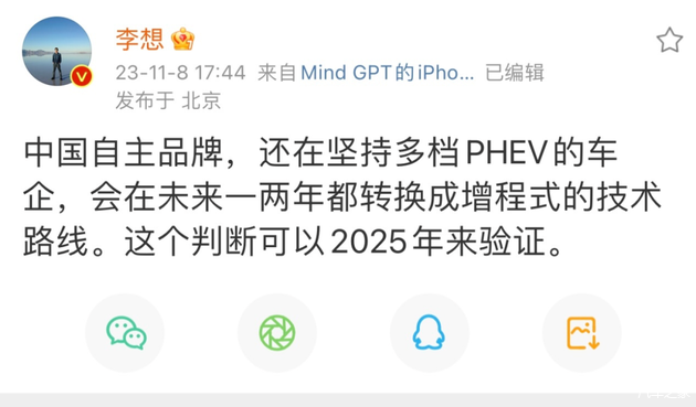 2023 年 11 月,理想汽车 CEO 李想在微博抛出言论,称坚持多档 PHEV 的自主品牌车企,未来一两年都会转向增程式技术路线。