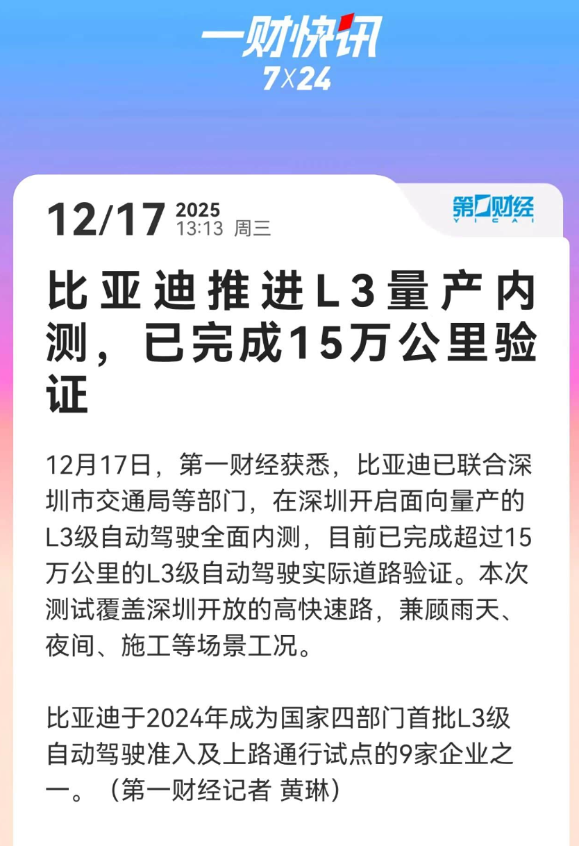 比亚迪推进自动驾驶内测!据了解,比亚迪已联合深圳市交通局等部门,在深圳开启面向量产的L3级自动驾驶全面内测,目前已完成超过15万公里的L3级自动驾驶实际道路验证。比亚迪推进自动驾驶内测以安全为核心,覆盖深圳开放的高快速路,兼顾雨天、夜间、施工等不同场景工况,全面验证L3级产品成熟度和可靠性,为国家L3级自动驾驶落地提供实践依据。 据悉,2023年比亚迪就已获得国内第一张L3级自动驾驶测试牌照,并于2024年成为国家四部门首批L3级自动驾驶准入及上路通行试点的9家企业之一。