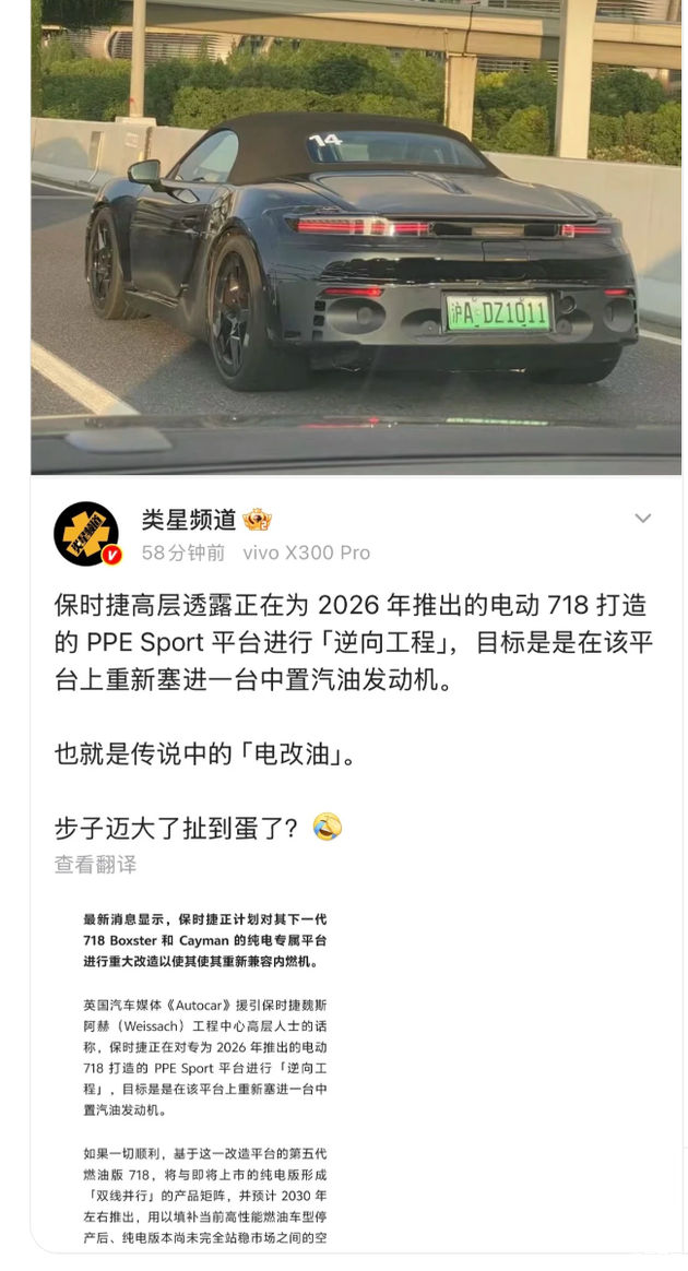 “纯电 718 说没就没了?” 保时捷的操作让车圈炸了锅 —— 原本去年就路试、计划今年上市的纯电 718,突然被曝改成燃油车,甚至有消息称保时捷在为电动平台 “逆向工程” 塞回燃油发动机,被网友调侃成 “电改油”“电动变汽油”。这波反转,不是技术失误,是超跑品牌在电动化浪潮里的 “性能妥协”。