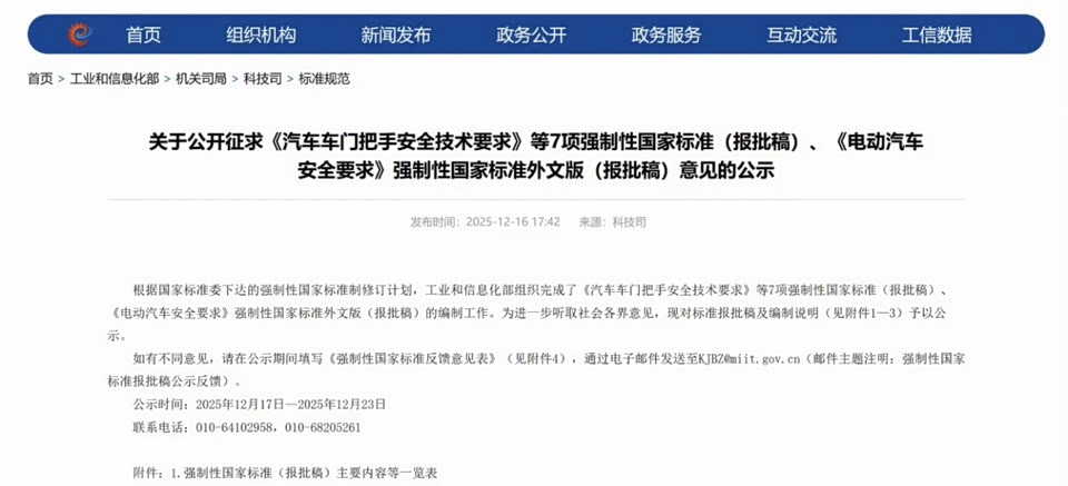 工信部最新《汽车车门把手安全技术要求》规定“每个车门(不含尾门)应配备可机械释放的车门外把手。 即便车辆带有电子控制式 / 自动激活式锁止装置,在锁止状态下也应满足事故后可机械开启”。