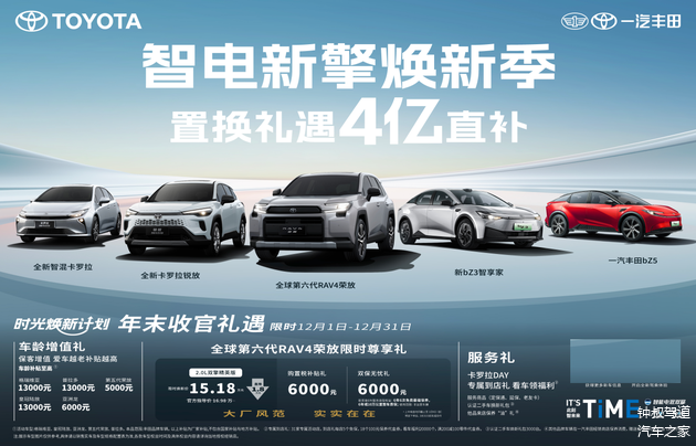 年终冲刺阶段,一汽丰田推出的4亿元厂家直补“智电新擎焕新季”,进一步放大了技术与产品的价值优势。全新荣放2.0L双擎精英版限时焕新价低至15.18万元,叠加购置税补贴与双保无忧礼,形成“一次入手、长期受益”的消费闭环;皇冠陆放、普拉多等重磅车型的车龄增值礼,更以极致诚意降低用户置换门槛。