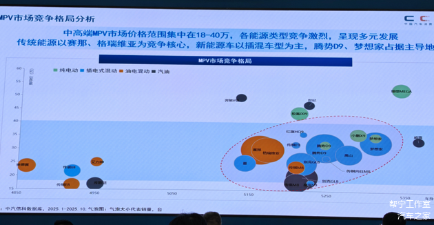 第二阵营是以腾势D9混动版等为核心的插电混动车型。这类是新能源MPV赛道的竞争焦点。