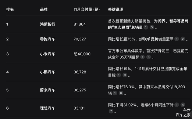 它们在车型榜上没有任何一款产品进入前10,当下最有希望的理想i6要看产能跟进的效率。同时它们在厂商排名榜上也低于小米和鸿蒙智行。