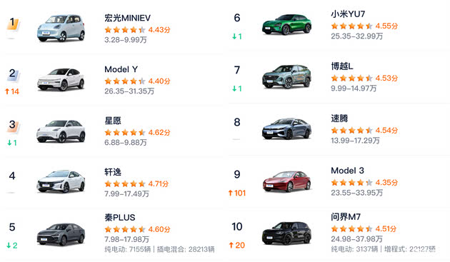 另一个方面,10以下价位产品同样占据4个席位,排名第1的宏光MINIEV销量超过5.6万,排名第10的比亚迪海鸥销量超过2.1万。(秦PLUS由汽车之家统计的经销商报价为6.98万-11.98万,主销车型绝大多数成交价在10万以下,因此也归于10万以下市场)