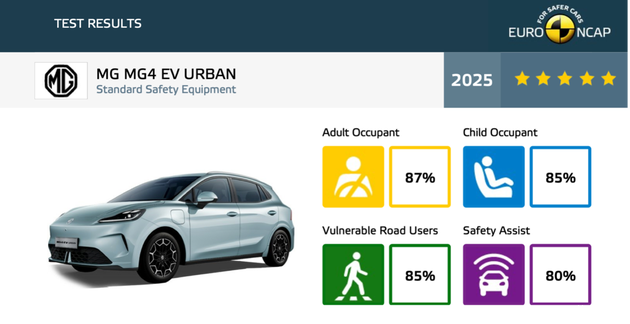 除了电池安全领先行业,整车安全亦获国际权威认可。在最新一期Euro NCAP欧洲新车碰撞测试中,全新MG4荣膺五星安全评级,在成人乘员保护、儿童乘员保护、弱势道路使用者保护及安全辅助系统四大测试项目中均获高分,安全含金量持续提升。