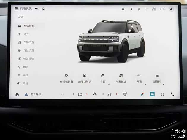 设计上, 福特智趣烈马延续了家族标志性的硬派风格,方正的车身轮廓搭配粗壮的贯穿式镀铬饰条,勾勒出极具力量感的设计风格。可点亮的“BRONCO”品牌标识,配合横向双层布局的灯带,看上去野性十足。此外,新车在机舱盖前部设计有集成式贯穿风道。