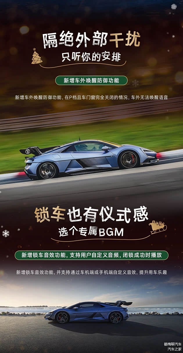 对于追求极致个性与体验的仰望U9车主,本次OTA注入了更多专属的乐趣与安心。它赋予了锁车动作独特的仪式感,用户可以通过车机或手机,为爱车设定一段专属的锁车提示音,在专属BGM加持下,让锁车也有满满的乐趣。