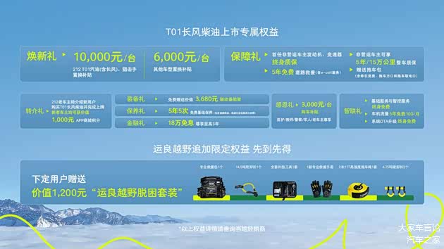T01长风柴油上市售价19.88万元。为让更多用户轻松开启越野生活,T01长风柴油推出诚意上市权益:包括至高3年18万免息金融政策,T01汽油版及狙击手老车主可享10000元置换补贴;首任非营运车主更享发动机变速箱终身质保,5年5次免费基础保养,5年免费道路救援,以及联动备胎架及拖车包免费赠送;T01老车主介绍新用户购车,双方均可获得价值千元积分;军人、教师等特定群体额外享受3000元专属补贴。