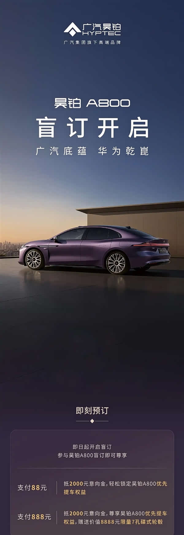 12月19日,广汽旗舰轿车昊铂A800开启盲订,支付88元订金可抵扣2000元意向金,并锁定优先提车权益;支付888元订金,在其基础上,再额外赠送价值8888元的限量7孔碟式轮毂。新车定位豪华中大型增程轿车,车长5130mm、轴距3020mm,配1.5T增程系统,CLTC纯电续航220km,亏电油耗5.74L/100km;配置方面,新车配备华为乾崑ADS 4.0、鸿蒙座舱5、百万像素投影大灯、23扬声器音响、Nappa真皮座椅、车载冰箱等,预计售价约30万元,竞争享界S9、岚图追光L、56E等。