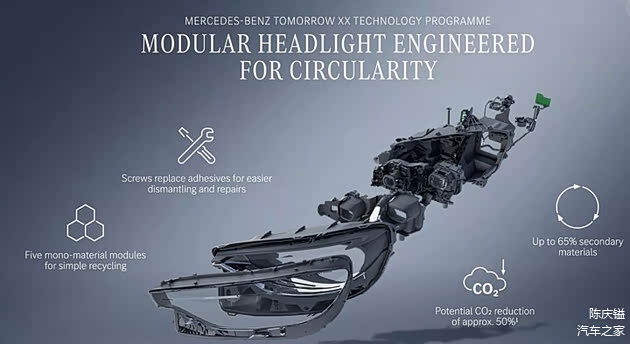 在 Tomorrow XX 计划中,其将以往采用胶合方式结合零件的车辆头灯组总成,改为以螺丝固定,使其可以拆解成各个零件,让未来车用头灯组的维修和回收更为方便,且可使回收物含量翻倍,并将碳足迹减半。此外奔驰也计划开发全新的三明治夹层内饰材质,取代以往使用的混合性塑胶零件,其具备了达到 65%回收率,可适用于车辆的内饰门饰板等处。