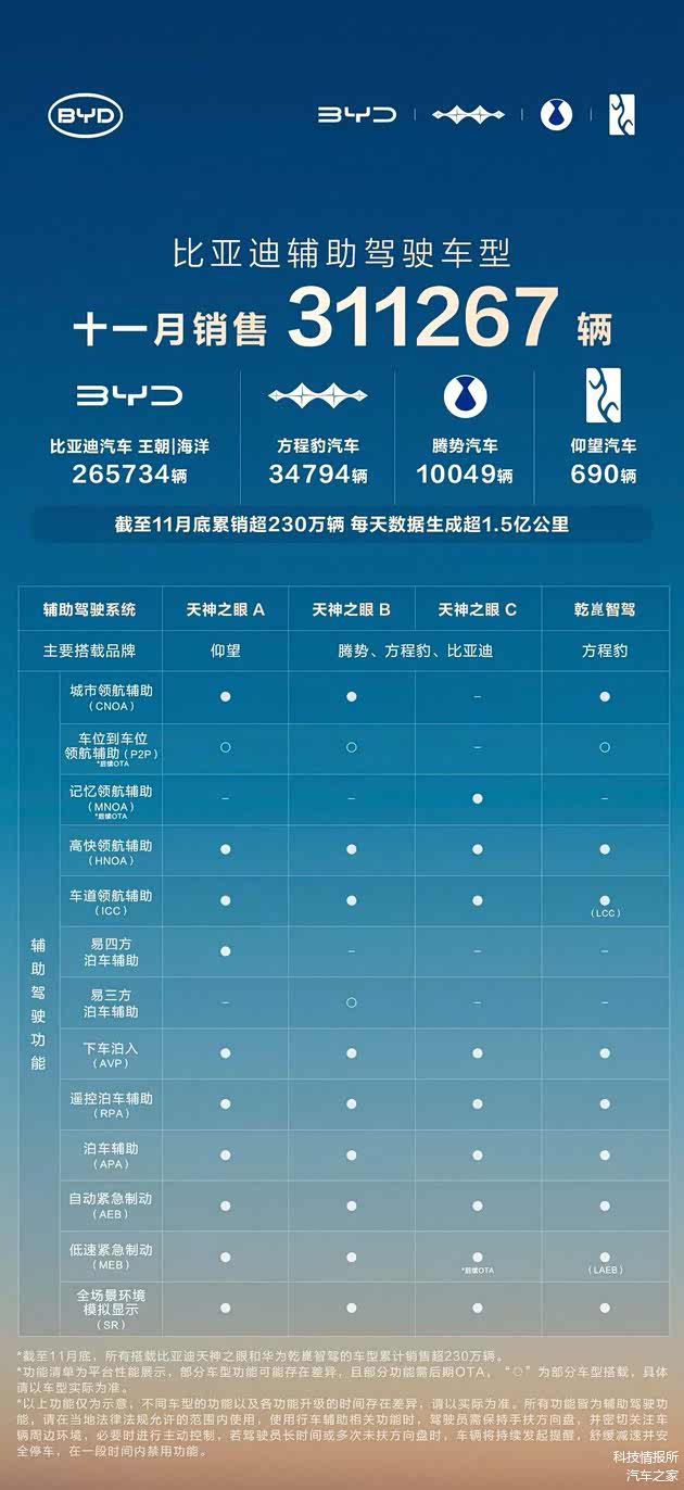 近日,11月智能辅助驾驶车型销量数据正式揭晓,比亚迪再次以压倒性优势领跑全场,旗下搭载“天神之眼”辅助驾驶系统的车型月销量突破31万辆大关,达到311267辆,持续巩固其在中国智能驾驶市场的绝对领先地位。这份成绩单不仅是一个数字的胜利,更是比亚迪在智能化道路上坚实步伐的生动写照,也让无数关注汽车科技进展的消费者为之振奋。