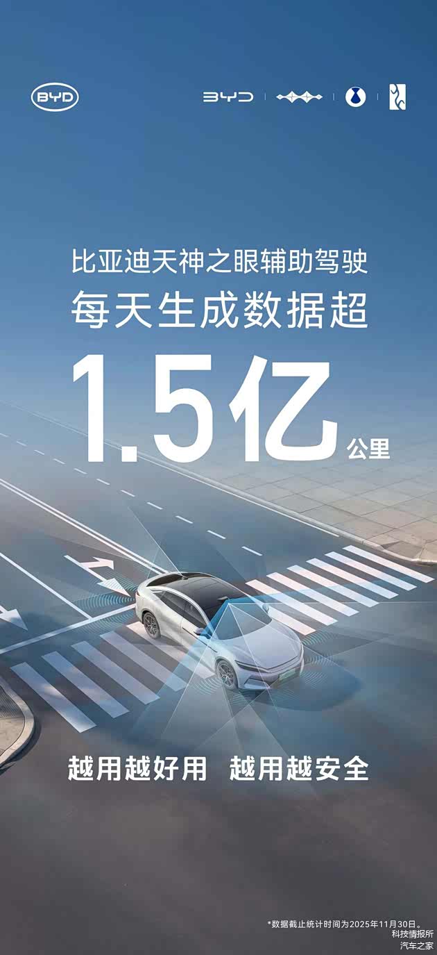 更令人瞩目的是,截至11月底,比亚迪搭载“天神之眼”系统的车型累计装车量已突破230万辆。这意味着,已经有超过230万个中国家庭,每天都在体验并信任着比亚迪的智能驾驶技术。而背后,是系统每日疯狂学习超过1.5亿公里的真实道路数据。这些来自天南地北、覆盖各种复杂场景的庞大信息流,构成了比亚迪辅助驾驶系统持续进化、越用越聪明的生命之源。它让“车在学习,人在受益”成为触手可及的现实,也让每一次OTA升级都充满令人期待的实质提升。
