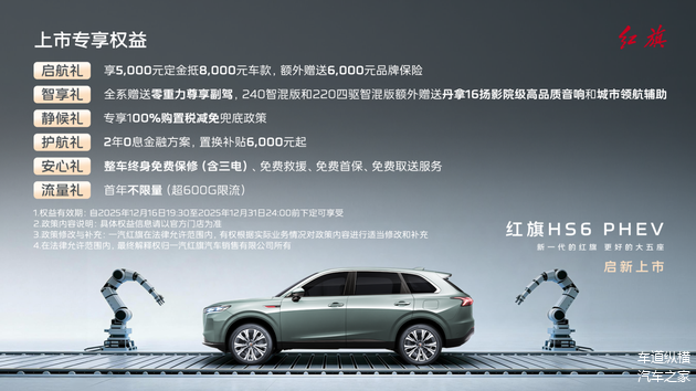 此次红旗HS6 PHEV上市,推出145智混版、240智混版、220四驱智混版三款车型,售价区间17.88万-22.88万元,同时带来了定金抵现、购置税减免、终身质保等多重重磅权益。作为红旗品牌从“为国造车”迈向“为家庭造车”的战略转型关键车型,这款车不仅承载着红旗在新能源车转型道路上的重任,更以“品价双优”的实力重塑了大五座SUV市场格局。经过我的全面试驾体验,红旗HS6 PHEV真正做到了“跟得上潮流需求,更守得住造车根本”,无论是空间、智能、动力还是安全,都能满足家庭用户的全能期待,相信这款“无需妥协”的旗舰SUV,必将成为更多中国家庭的出行首选。