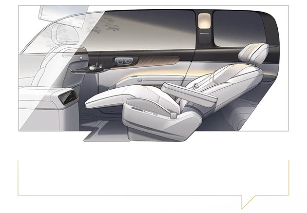 座椅方面采用的是2+2+2的六座布局,第二排配备有零重力座椅,而且还提供有后排小桌板,壁灯、航空阅读灯以及智能香氛系统都没有缺席。