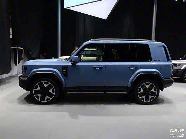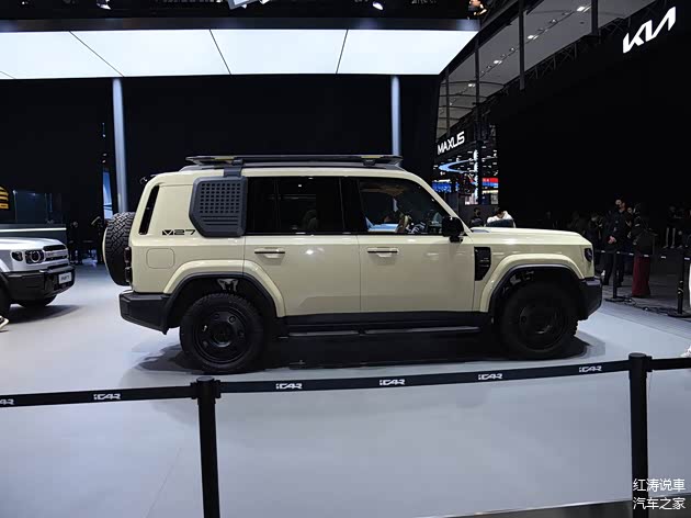 iCAR V27长宽高分别为4909(装备外挂式备胎时5055)/1976/1855(装备行李架时1894)毫米,轴距为2910毫米,方正的车身造型以及外扩式方形轮拱、黑色轮眉、脚踏板、行李架等,展示出阳刚和野性之美,而离地间隙等数据暂时还未公布,采用传统样式的门把手,部分车型提供车顶平台、黑色外后视镜等。