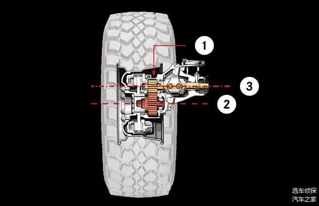 除了柔性车架,乌尼莫克还有独特的门式车桥,不仅用于提升离地间隙,轮毂处集成的轮毂减速齿轮,还承担着力矩分担作用,传动轴、差速器和半轴所承受的扭矩降低,提升系统耐久性。